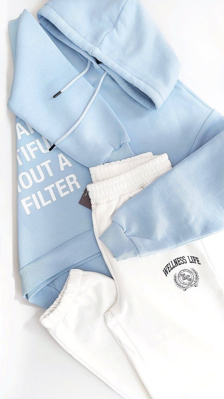رنگ: هودی آبی آسمانی و شلوار سفید